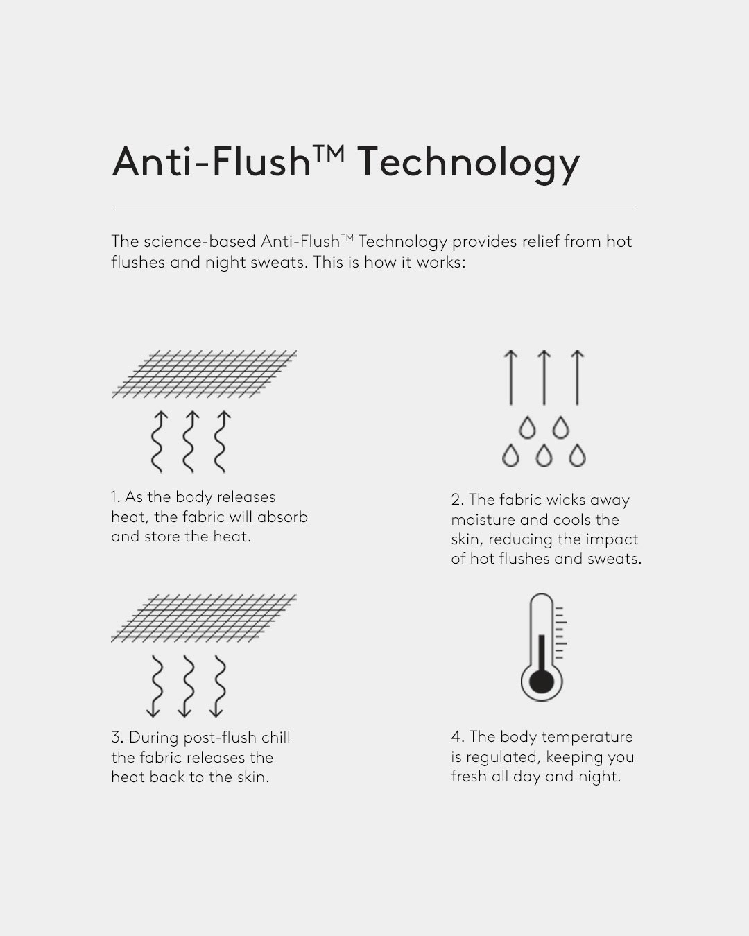 Tavoitteenamme on löytää älykkäitä ratkaisuja naisten todellisiin tarpeisiin. Sen vuoksi vaihdevuosiin tehdyt vaatteemme ja yöasumme on valmistettu innovatiivisella Anti-Flush™-tekniikalla, joka säätelee kehon lämpötilaa, tuoden helpotusta kuumiin aaltoihin ja yöhikoiluun. Olosi pysyy mukavana ja luottavaisena matkalla läpi vaihdevuosiesi ainutlaatuisen kokemuksen.