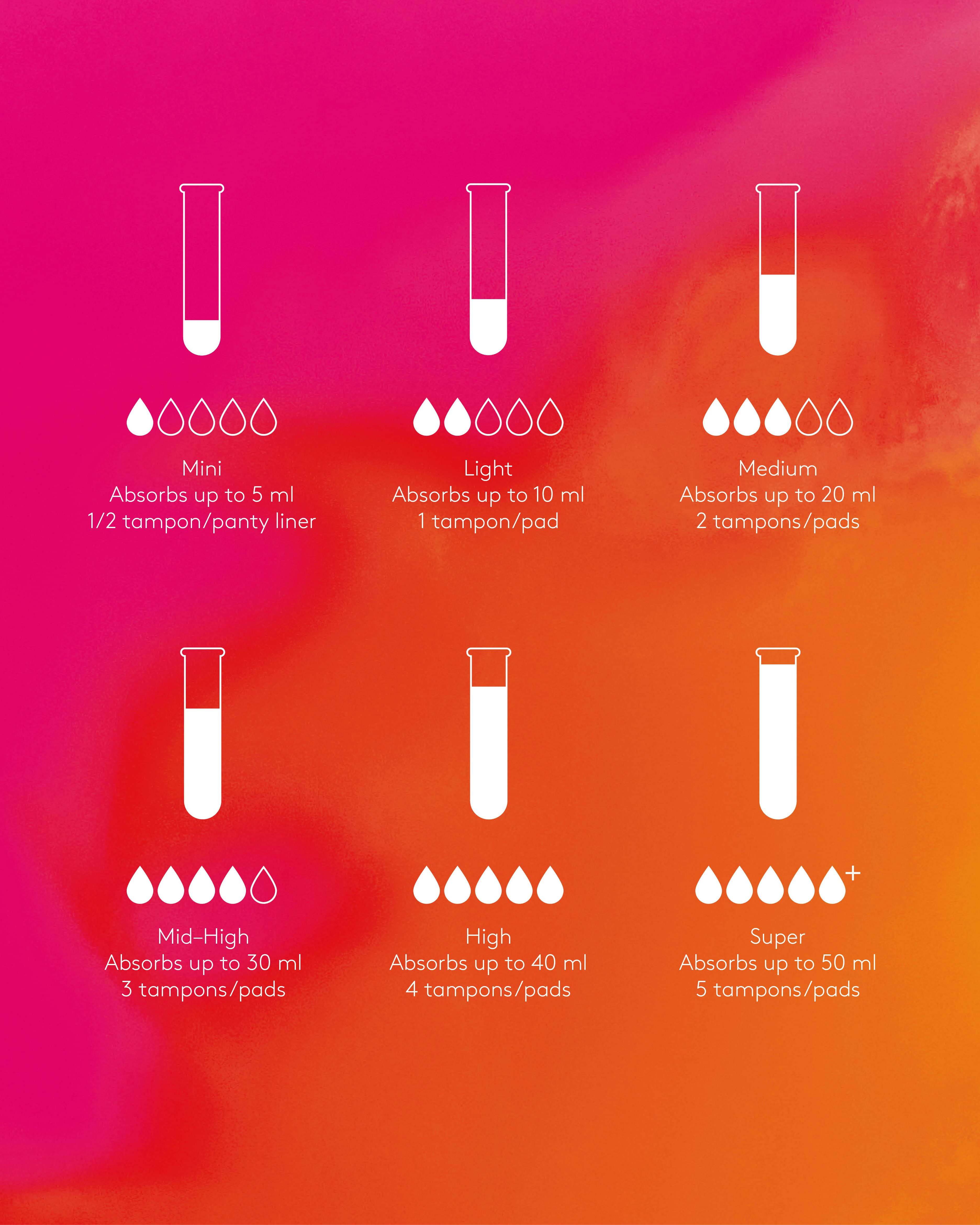 Kuukautisvuoto on yksilöllistä. Siksi kuukautisalushousut ovat saatavana kuudella eri imukyvyllä. Korkein imukyvyn taso (Super) imee itseensä jopa 50 ml nestettä, mikä vastaa noin viittä tamponia. Et tarvitse lisäsuojaa – voit luottaa täysin kuukautisalushousuihin.